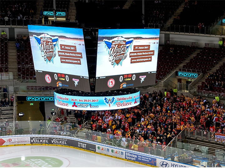 Scoreboards and replay displays in indoor and outdoor stadiums.