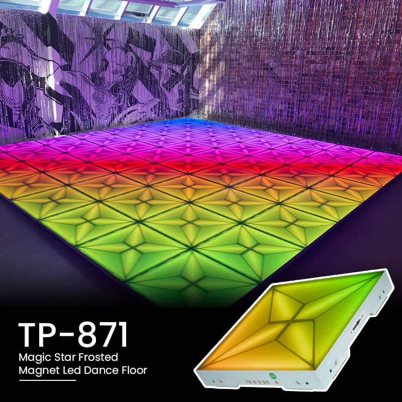 The bearing capacity of TP-871 Magic Star Frosted Magnet Led Dance Floor can be kept at a high level. Due to the advanced technology, the bearing capacity of each panel is more than 500-600 kg. Therefore, it is not a big deal for the TP-871 Magic Star Frosted Magnet Led dance floor to bear the weight of cars.