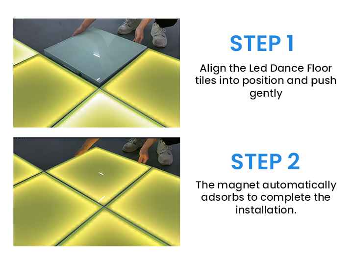 The surface of the dance floor is fully covered with strong 10mm tempered glass, which can bear 500kg-600kg. The tempered glass is extremely durable with strong impact resistance.